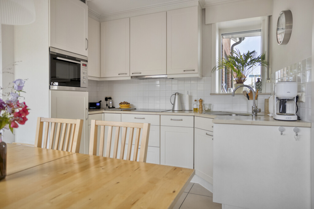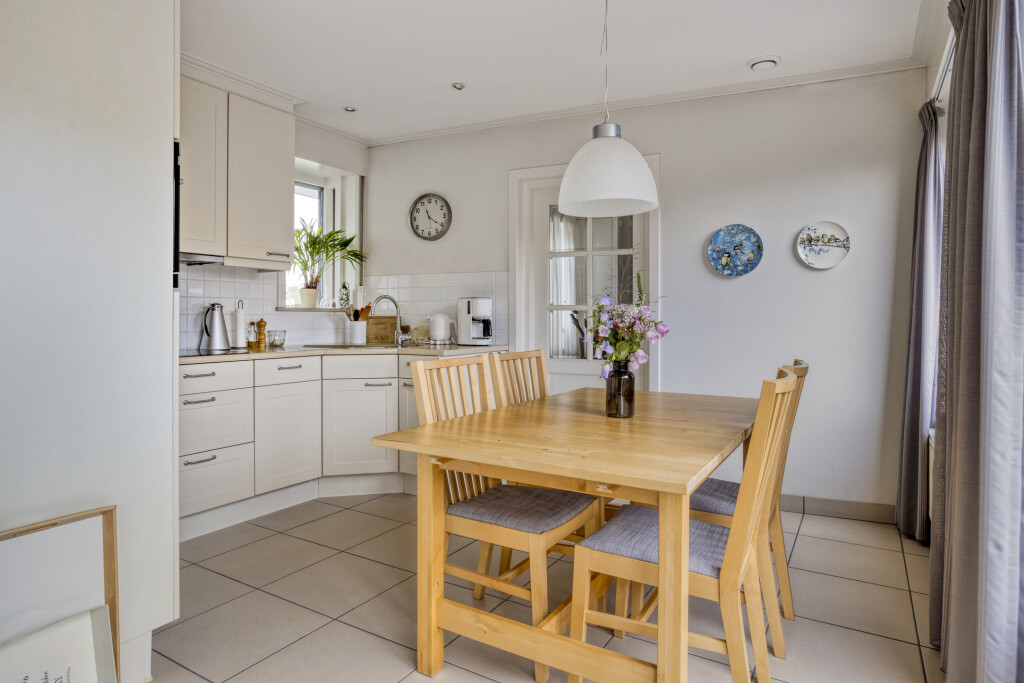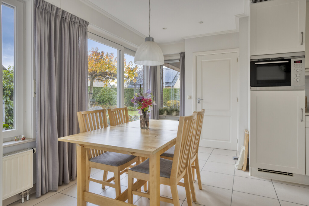 De woonkeuken, gesitueerd in de aanbouw, is tuingericht en uitgevoerd in een hoekopstelling met diverse inbouwapparatuur. Grote ramen en een schuifpui zorgen voor veel lichtinval en een prachtig uitzicht op het groen. De tegelvloer en inbouwspots maken het geheel af. Aansluitend bevinden zich de bijkeuken, het toilet en een kantoor/hobbyruimte.