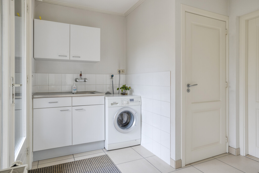 De bijkeuken beschikt over een keukenblok, tegelvloer, een ruime inbouwkast en aansluitingen voor wasapparatuur.