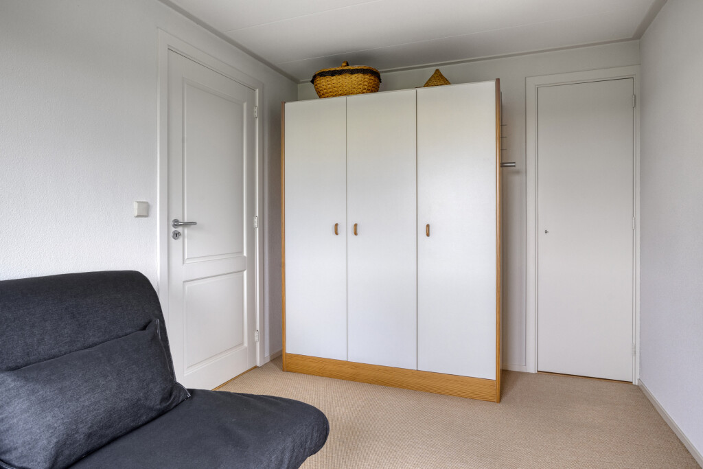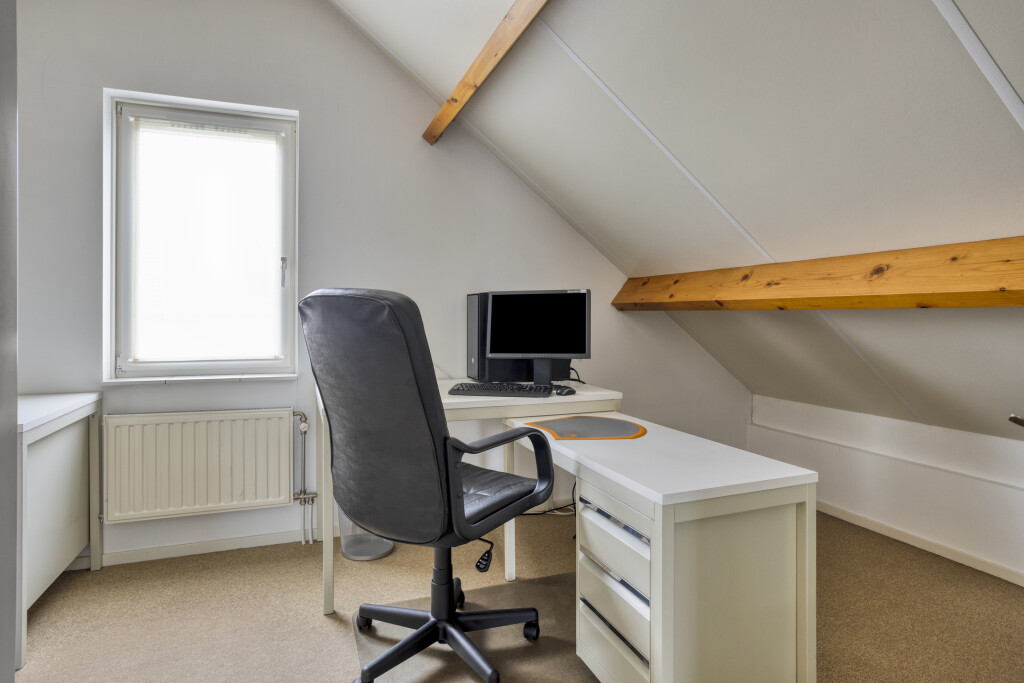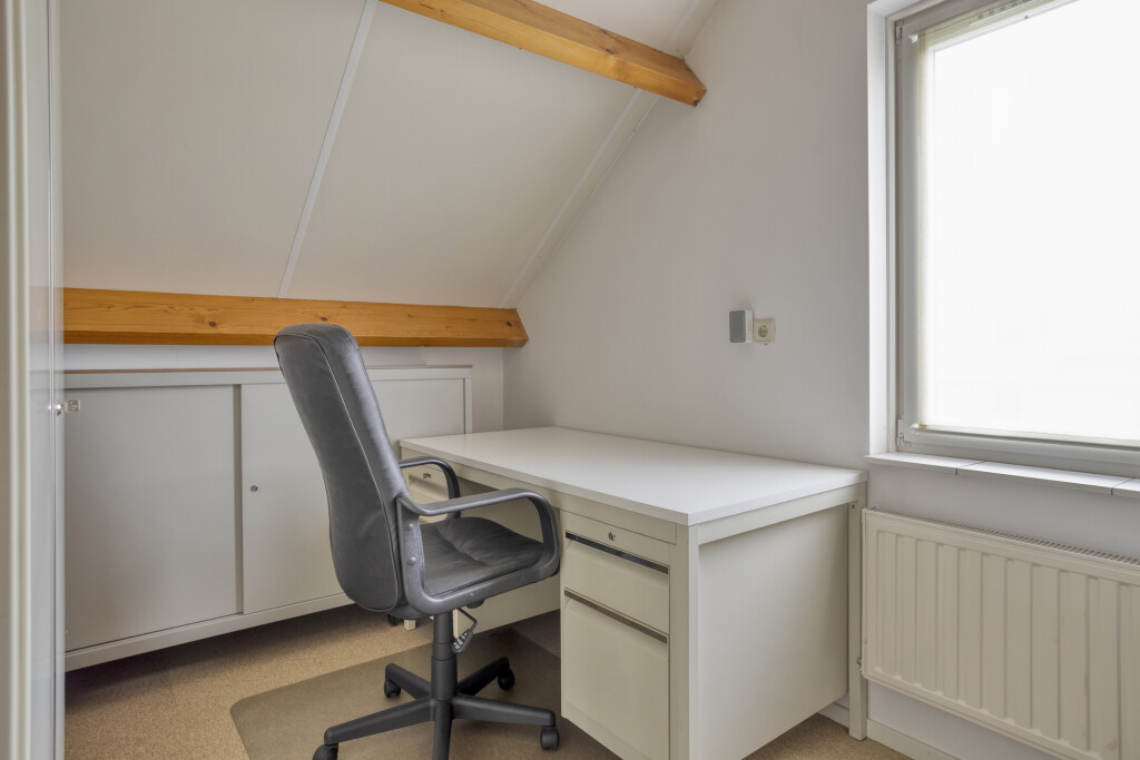 Via de trap in het kantoor/hobbyruimte bereikt u de extra verdieping boven de aanbouw. Hier bevindt zich een ruimte die nu ingericht is als kantoorruimte, een ruime vierde slaapkamer en de cv-installatie.