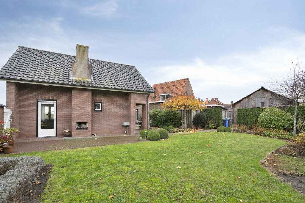 De ruime achtertuin ligt op het noordwesten en biedt volop zon en privacy. Hier geniet u van verschillende terrassen, een verzorgd gazon en borders met sierbeplanting. Een unieke eyecatcher is de ingebouwde open haard/barbecue, perfect voor zomerse avonden met familie en vrienden. De tuin is bereikbaar via een zijpoort (achterom).