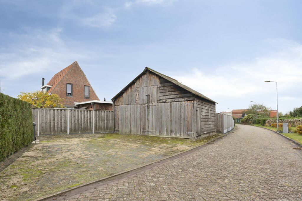 Links op het perceel staat een aparte houten schuur met vliering (628cm*705cm), ideaal voor het stallen van 1 of 2 auto's, als opslag of werkruimte.