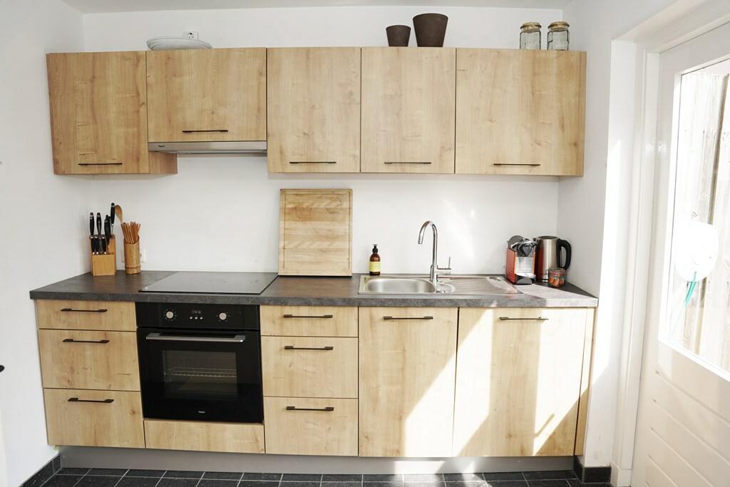De keuken is praktisch ingedeeld, heeft meer dan voldoende bergruimte en is uitgerust met deels inbouwapparatuur en deels losse (oven en koelkast) apparatuur.